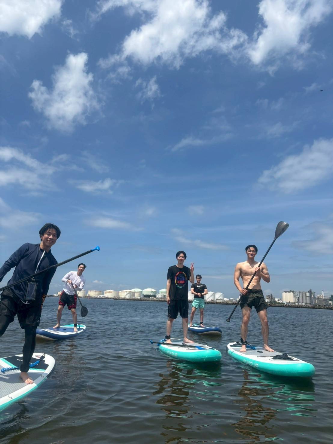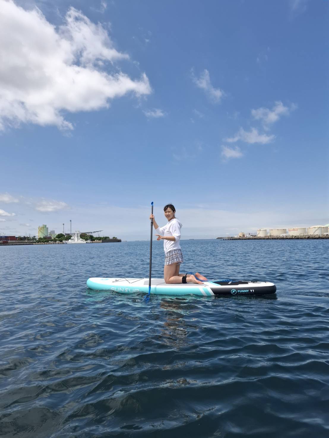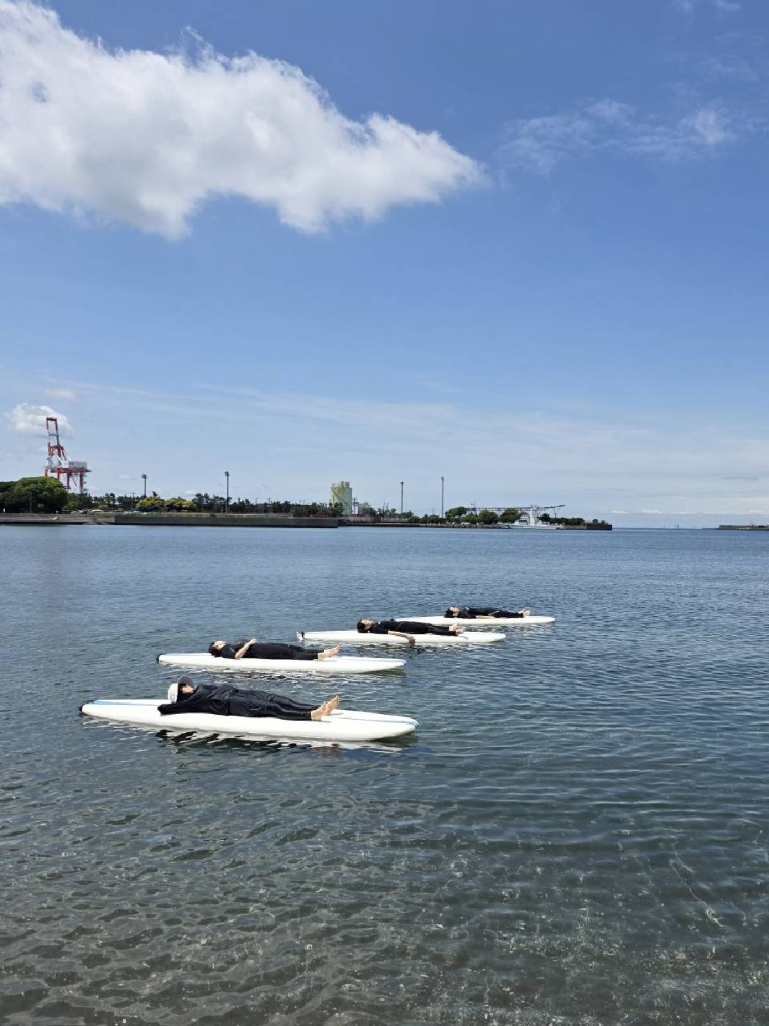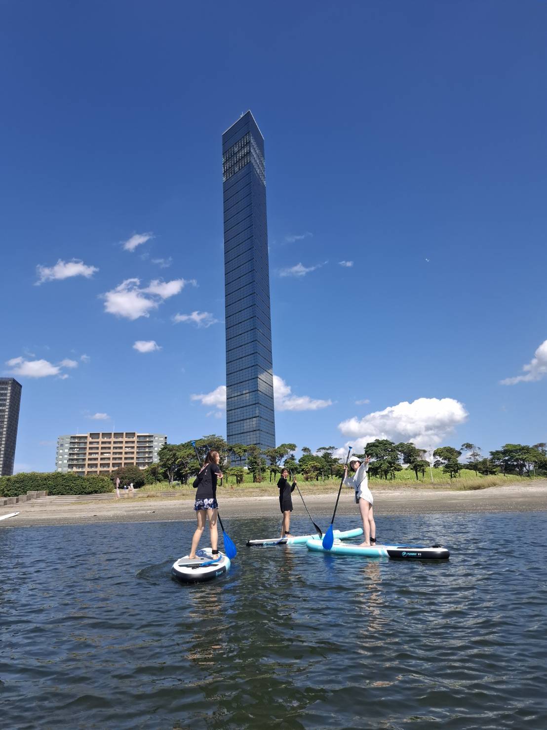 千葉ポートタワー前の穏やかな人工ビーチで、SUPヨガを体験できます!